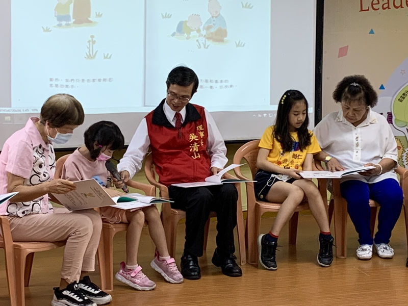 一一一教育發展協進會昨天在基隆市尚仁國小舉行「書香傳愛,共讀共樂」贈書活動,贈予基隆市十所國小每校一萬元的國語日報圖書,並由理事長吳清山(中)和爺爺、奶奶、學童共讀繪本,享受溫馨時光。